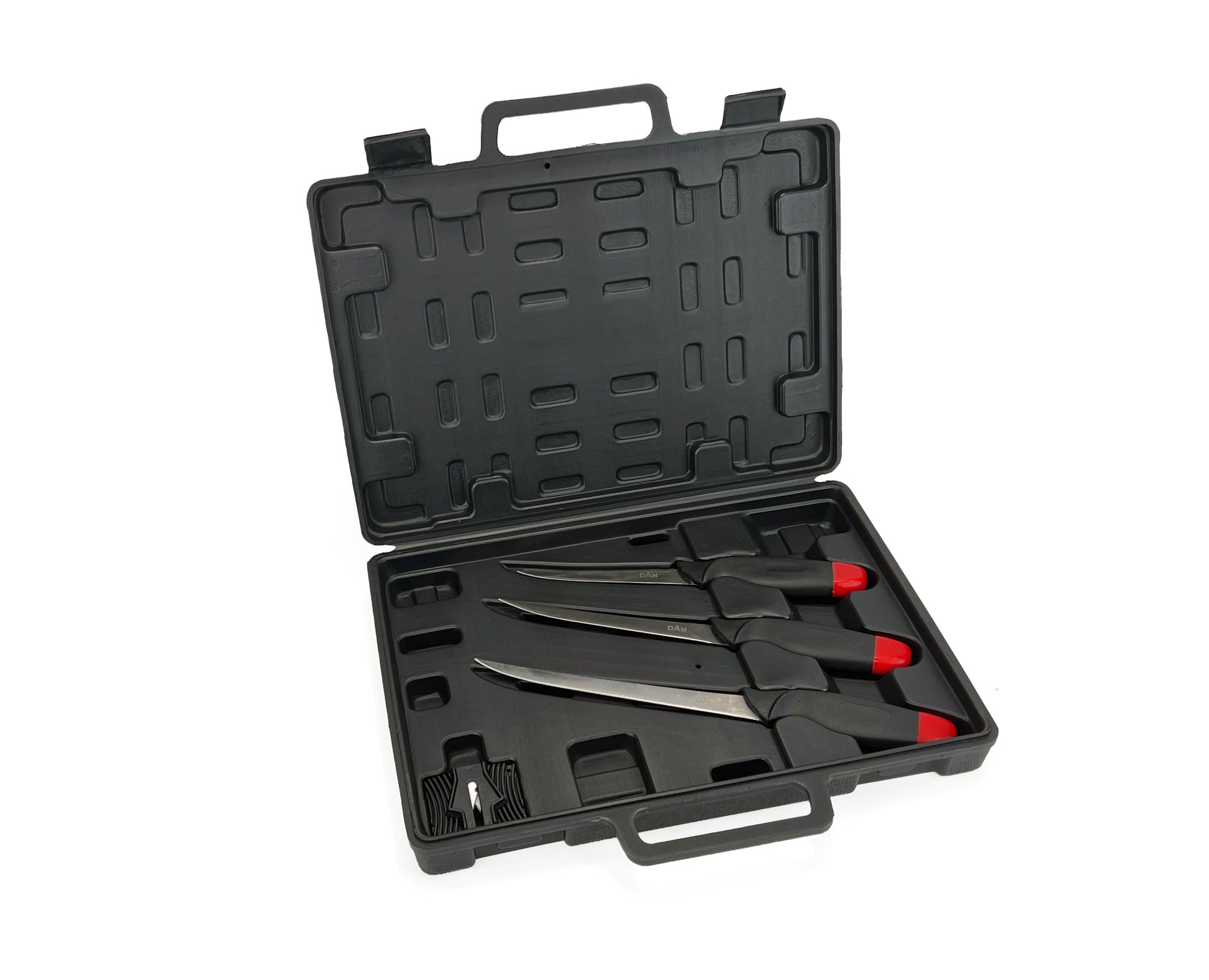 This set contains of three high quality knives, each different in length and a handy sharpener. The knife blades are made or hardened stainless steel and the handles are from high quality rubber. Comes in a high-quality hard case, so you can store or transport everything in an orderly and safe way.