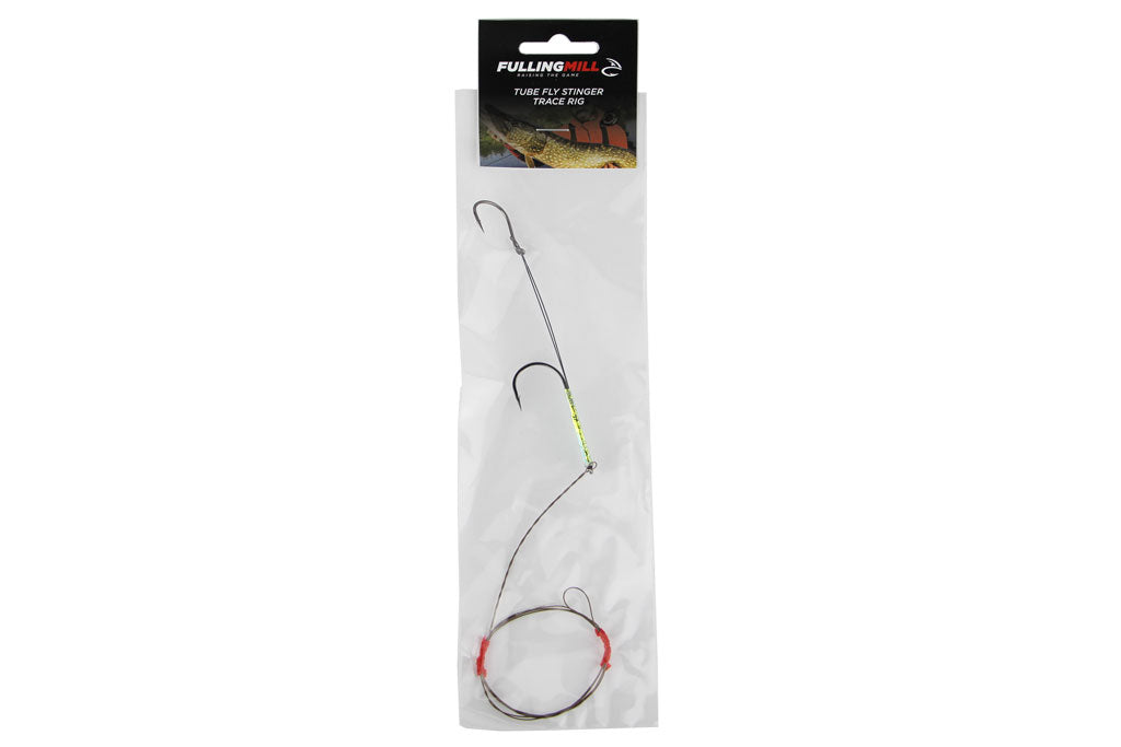 A stinger trace rig, to be used in conjunction with Fulling Mill Pike Tube Flies. Slide the loop of the trace through the plastic tube of your fly and seat the eye of the hook in the rear of the tube. The trace is then attached 'Loop to Loop' to your fluorocarbon leader.