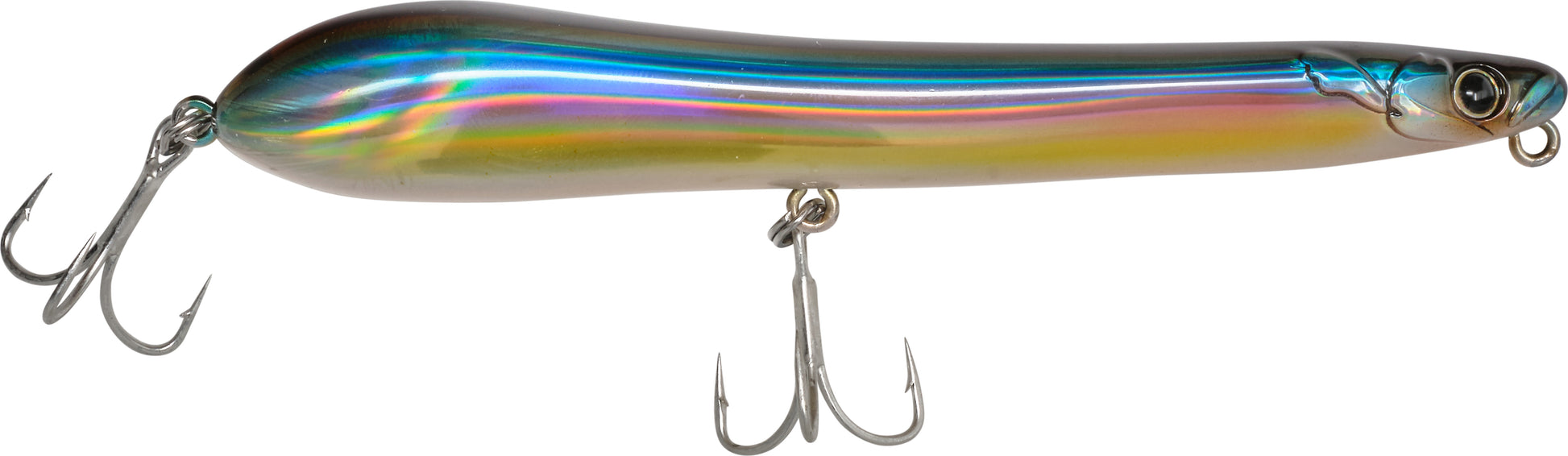 Unique to HTO, this tail weighted lure is aerodynamic and stable, allowing it to cast extreme distances. When fished static, the lure sits tail down, waiting for a predator to strike. Put some action into it, and this lure will effortlessly slide from side to side, making it one of the easiest lures to walk the dog. Fitted with stainless-steel split rings and Owner ST-46 Treble Hooks.