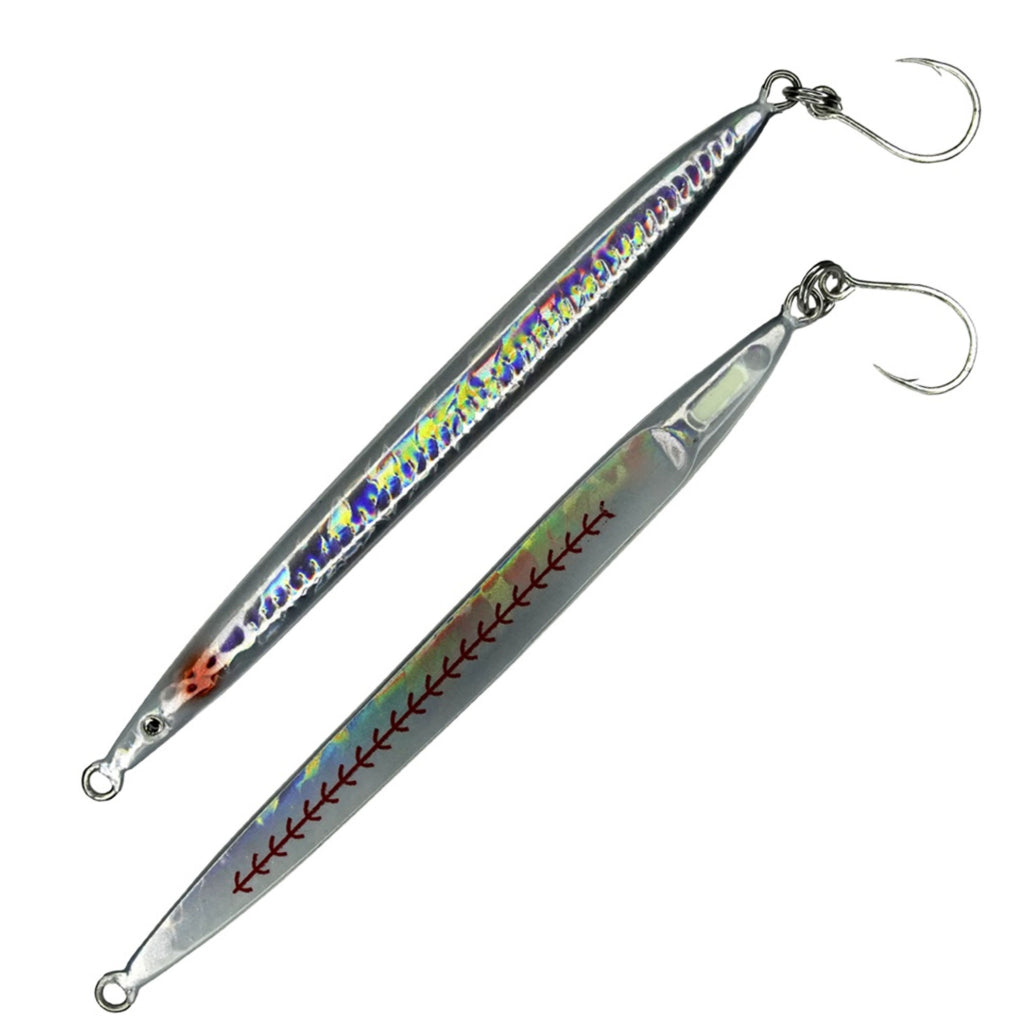 A sandeel style metal lure that is deadly for predatory species such as bass, pollack as well as wrasse. The lure is thicker towards the back, which helps to realistically replicate the swimming action of a sandeel. The full width design at the tail end helps the lure to cast straighter and more stable for greater distances and accuracy. The lure is available in a variety of different colours and comes with a glow in the dark “hit spot” next to the hook for added attraction. The Bloody Mackerel and Bloody Pearl lures feature red, bleeding spines, while the Sandeel and Midnights colours have glow in the dark spines. All lures fitted with HTO Inline Single Hook.
