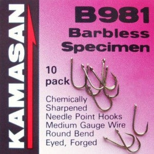 The Kamasan B981 Hooks are the barbless version of the B980s. Produced in a medium gauge high carbon wire it is an ideal barbless hook for all big fish.
