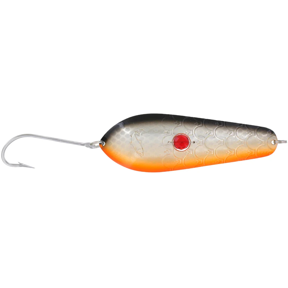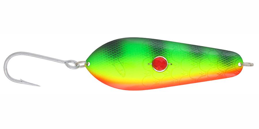 This lure works in both cold and warm weather. The color chart has the known colors for big pike! Improve the swimming of the spoon by putting a jig tail on the jätti-Räsänen's single-pronged hook. This way the spoon becomes even more lively and fishy. The single-pronged hook is easy to remove from the fish and it doesn't get caught easily in aquatic plants, so you can fish with it even in difficult places.